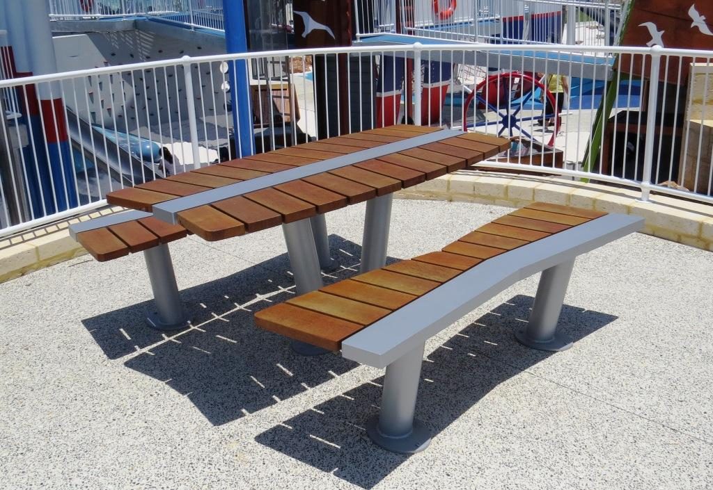 'BOTANICA' street furniture and park furniture - Picnic Table Setting. Benches and Tables can be connected together, creating longer table settings. Powder coated aluminium frames.